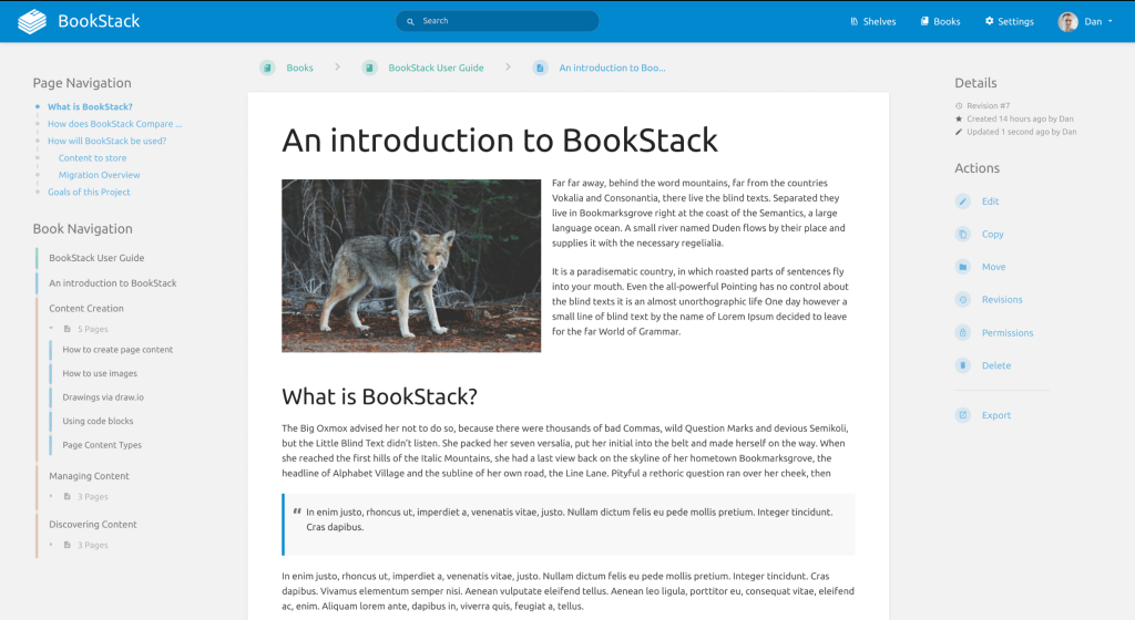 BookStack’s interface is beautiful and simple. Instructional designers can create content for your internal knowledge base and bucket the content into an easy-to-understand hierarchy: books, chapters, and pages. And employees can easily find learning content using the BookStack search feature.